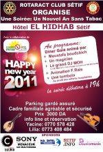 A l’occasion de la manifestation « une année 2011 sans tabac », le Rotaract Club Sétif organise le 31 décembre prochain à partir 19 heures une soirée réveillon « familial » qui aura lieu à l’hôtel El-Hidhab près du parc d’attraction de Sétif.